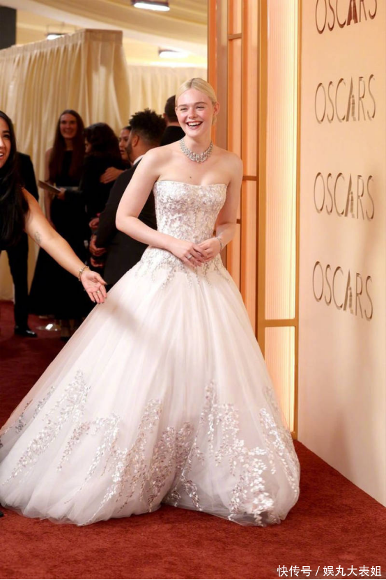 艾丽·范宁则以一袭纪梵希特别定制的白色抹胸刺绣纱裙亮相,将高雅大方的气质展现得恰到好处。纯净的白色自带高级滤镜,抹胸设计简约大气,露出优美的肩颈与锁骨线条,裙身点缀细腻的银色紫藤花刺绣,薄纱层叠轻盈,浪漫又温柔。她佩戴卡地亚典藏古董紫藤项链,与裙身刺绣花纹相得益彰,搭配利落盘发,既延续了她一贯的公主感,又多了几分成熟优雅,站在红毯上,宛如自带柔光滤镜,高雅大方的气质扑面而来,完美诠释了“白裙封神”的浪漫意境。