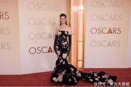 安妮·海瑟薇则依旧是红毯上的“常青树”,一袭华伦天奴2026春夏高级定制黑色抹胸鱼尾裙,将她的迷人气质展现得淋漓尽致。经典的黑丝绒材质自带温润光泽,简约的抹胸设计大方露出优美的肩颈线条,收腰剪裁精准勾勒纤细腰肢,鱼尾裙摆轻盈垂落,复古优雅中透着强大气场。裙身点缀的柔粉花卉刺绣,为沉稳的黑色注入浪漫气息,搭配宝格丽高级珠宝,耳环与手链呼应刺绣主题,精致感拉满。她在红毯上频频开怀大笑,松弛感十足,既有好莱坞经典女星的优雅,又有不刻意的灵动,魅力无法阻挡。